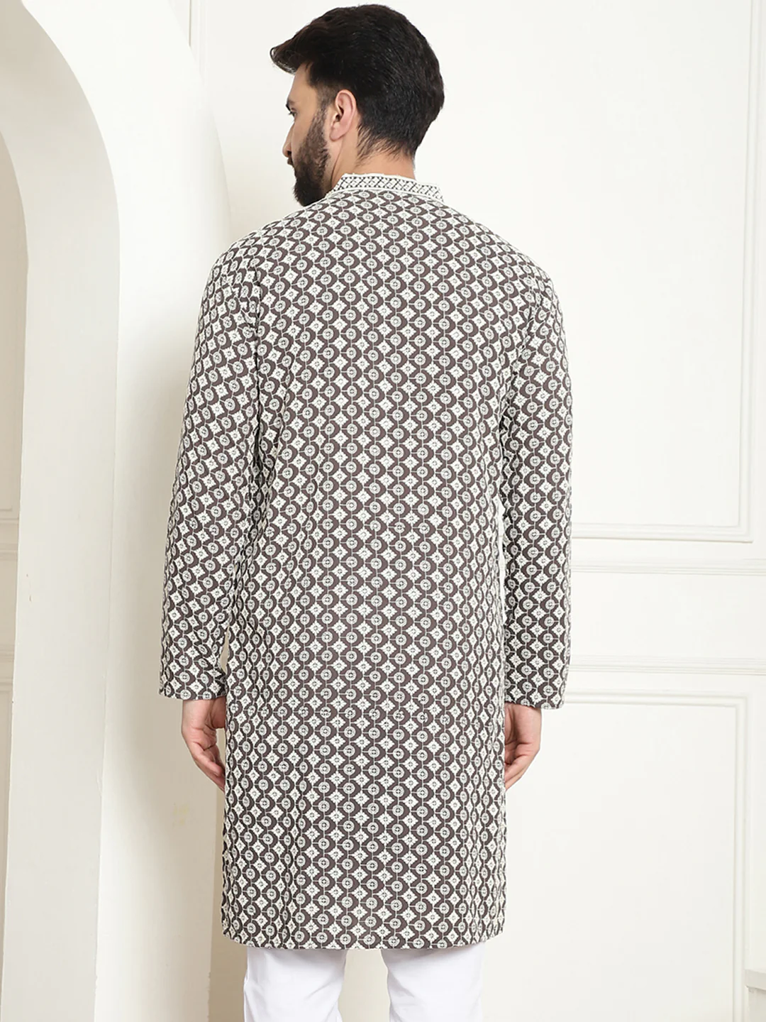 Men's Cotton Contrast Embroidered Sequinned White Long Kurta