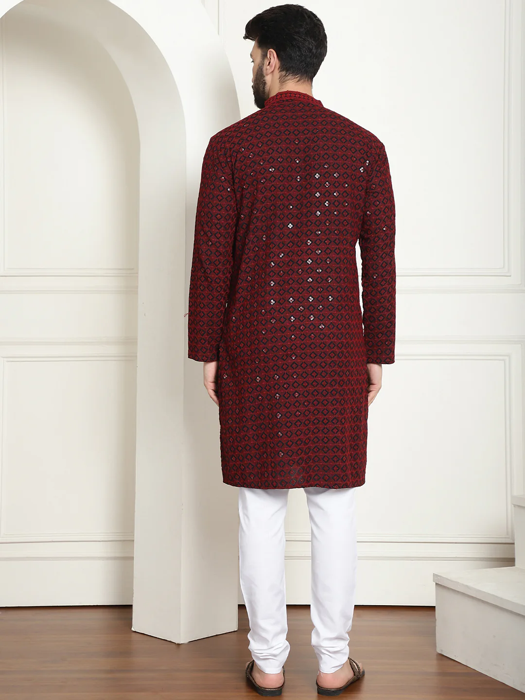 Men's Cotton Gold Embroidered Sequinned Maroon Kurta With white churidar Pyjama