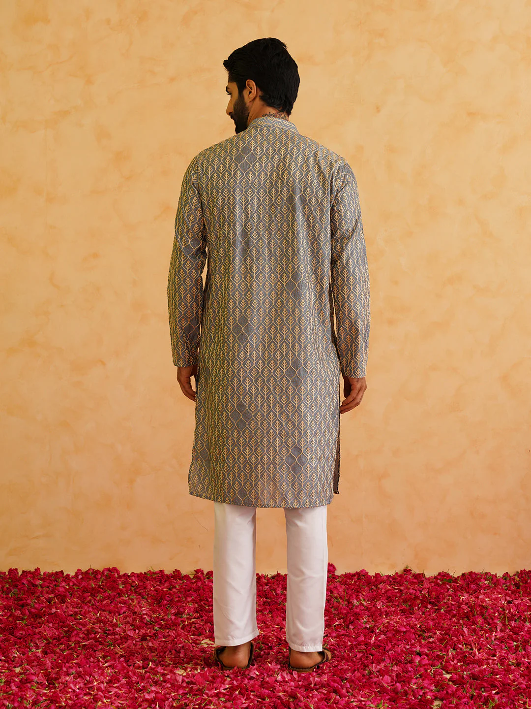 Men's Cotton Gold Thread Embroidered Light Grey Kurta