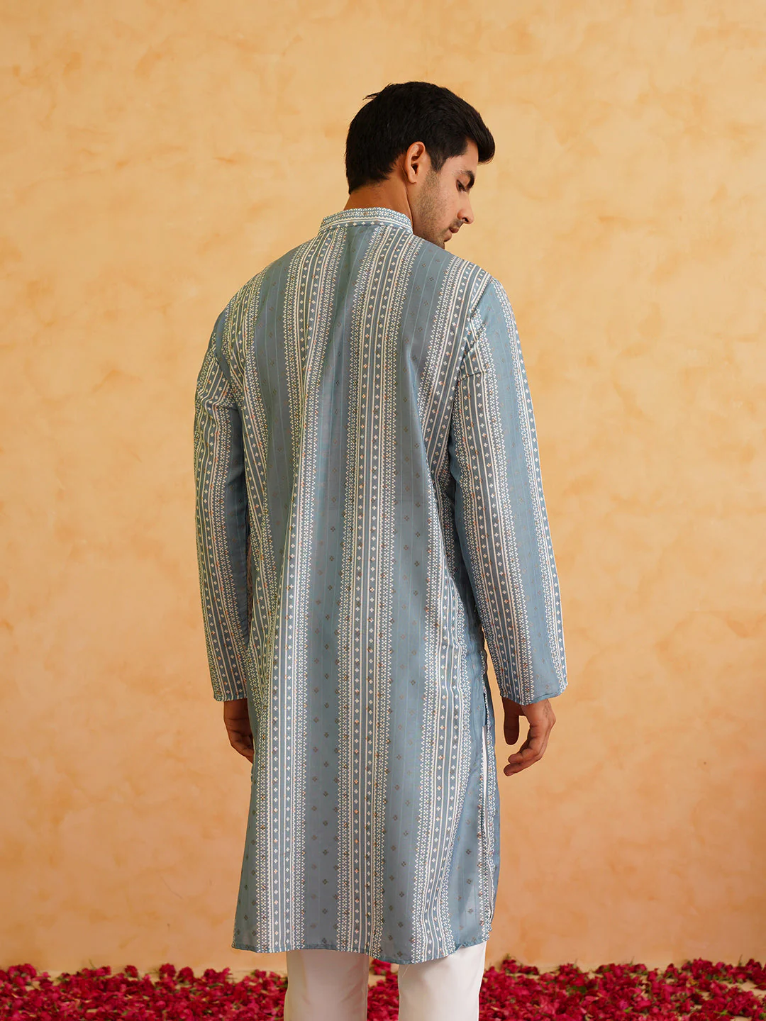 -70%Men's Cotton Silk Printed Teal Blue Kurta—