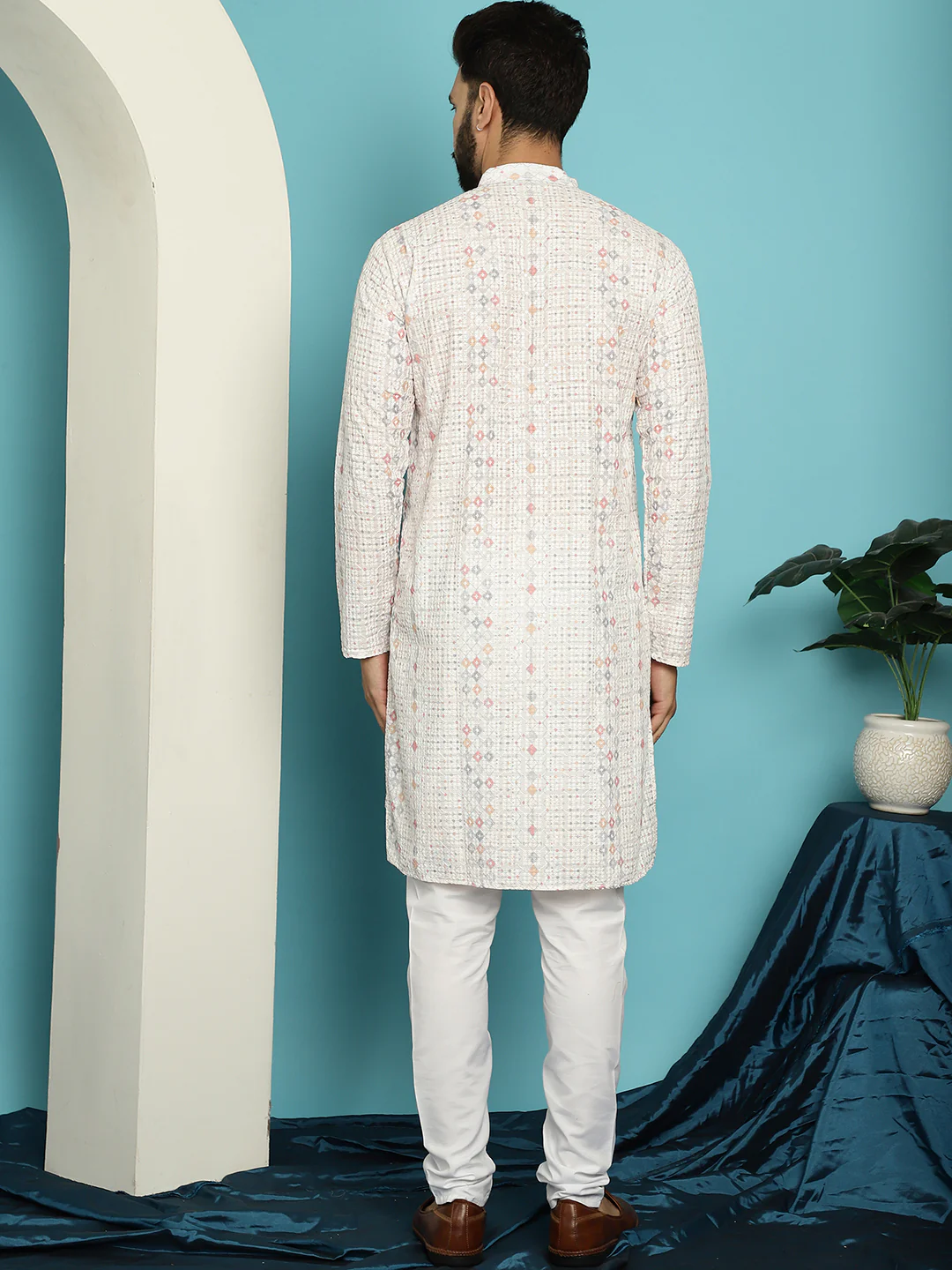 Men's Regular Thread Work Cotton White Kurta with Churidar