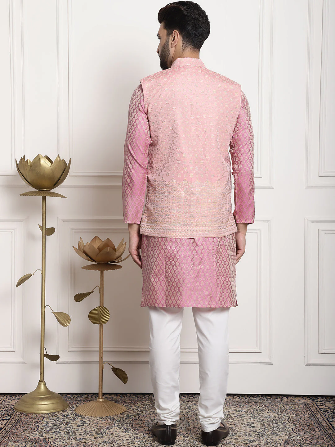 Men's Jacquard Silk Pink Kurta and Off-White Pyjama With Pink Nehru Jacket