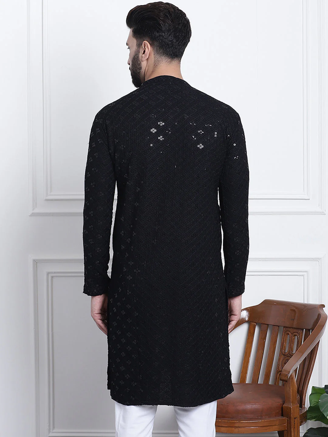 Men's Pure Cotton Black Embroidered 4Booti Sequence Kurta