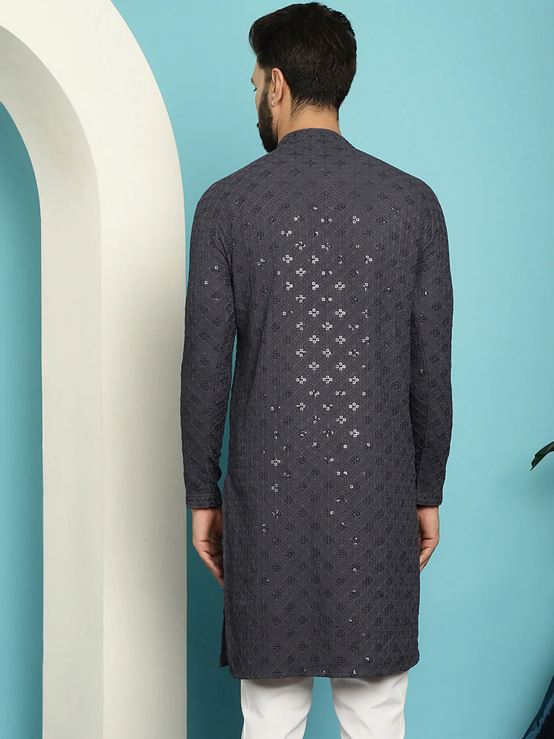 -70%Men's Pure Cotton Grey Embroidered 4Booti Sequence Kurta—